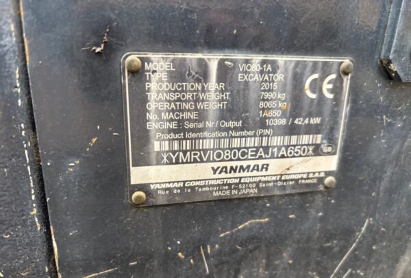 Baujahr 2015, 5.687 Betriebsstunden, Einsatzgewicht ca. 8.000 kg, Grabtiefe ca. 4,0 m, Klimaanlage, Radio, elektrische Betankungspumpe, 2 Zusatzhydraulikkreise, Böschungslöffel 1.600 mm, Tieflöffel 1.000 mm / 700 mm / 400 mm, neuer Ersatzgummikettenstrang, ausschließlich bei Yanmar gewartet.